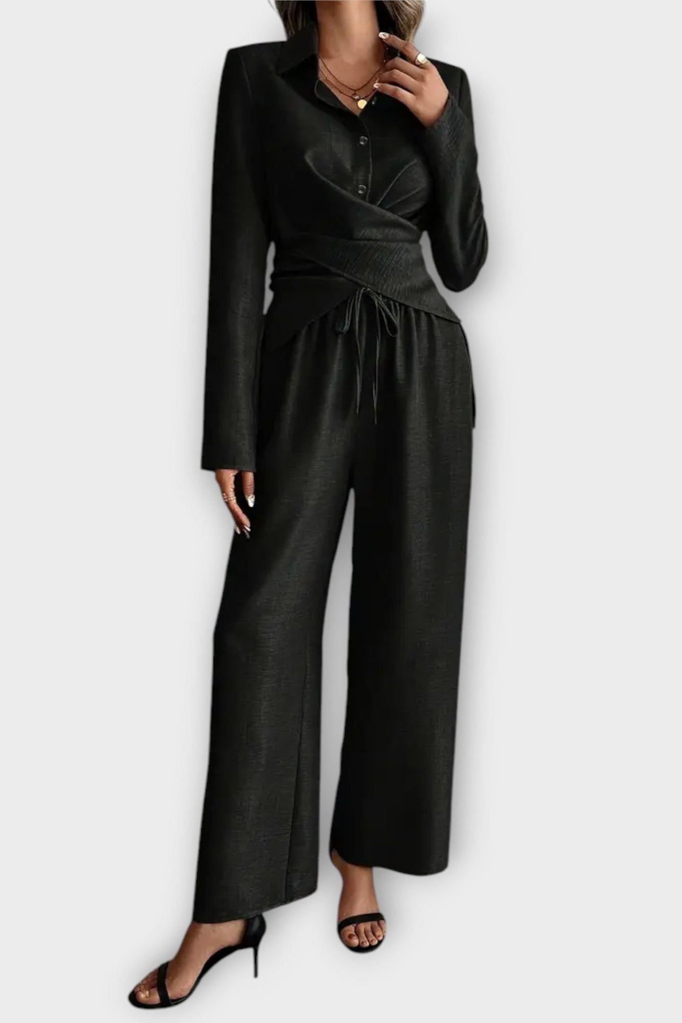 • Pasform og silhuet: Afslappet top og bukser med brede ben, der giver bevægelsesfrihed og en flatterende silhouette.
