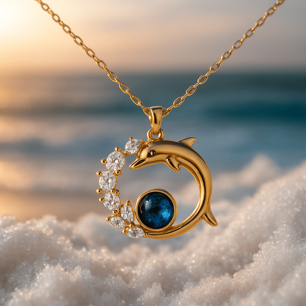 Majken | Delfin Vedhæng udstråler maritim elegance og tidsløs kvalitet. Den guldfarvede delfinform og den koboltblå centraltsten afspejler håndværkets omtanke og en arv af raffineret design. Hver detalje udføres med omhu, så smykket bærer en rolig styrke og en diskret luksus, der passer til både hverdagen og særlige øjeblikke. Med cirka 3 cm i diameter er det let og behageligt at bære, og i en begrænset udgave følger det naturlig samlerappel gennem minder og milepæle. Håndlavet i detaljer med omtanke og faglig stolthed, der spejler en lang tradition for dansk design.