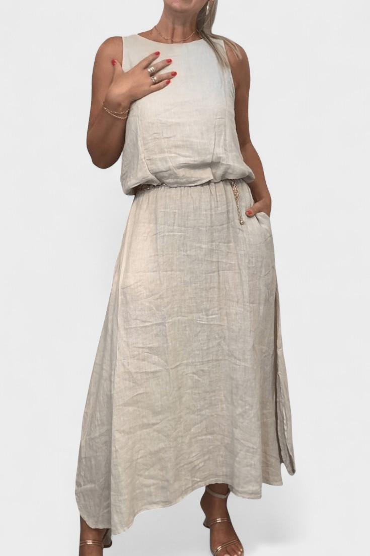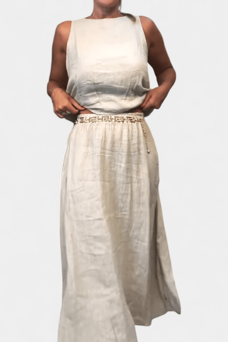 Meliora | Sæt udstråler tidløs elegance og en diskret luksus, der taler til den varige værdi. Sættet forener sommerens essens i en afslappet, men sofistikeret silhuet bestående af en løs vest uden ærmer og en lang, draperet nederdel med sidelommer. Lin- og bomuldsstoffet ånder og udvikler en naturlig glans over tid, mens håndværket og oprindelsen tydeligt afspejles i hver detalje. Produktion foregår i små partier med præcision og omtanke, hvilket understreger sætets eksklusivitet og langtidsholdbarhed. Meliora | Sæt tilbyder et tidsløst sommerlook med langvarig værdi og samlerværdi— ideelt for strand, by og sociale begivenheder, og let at mixe til en sofistikeret, æstetisk stil. Sættet 'Meliora | Sæt' er derfor ikke kun en beklædningsgenstand, men en investering i tidløs håndværkskunst, der giver glæde sæson efter sæson.