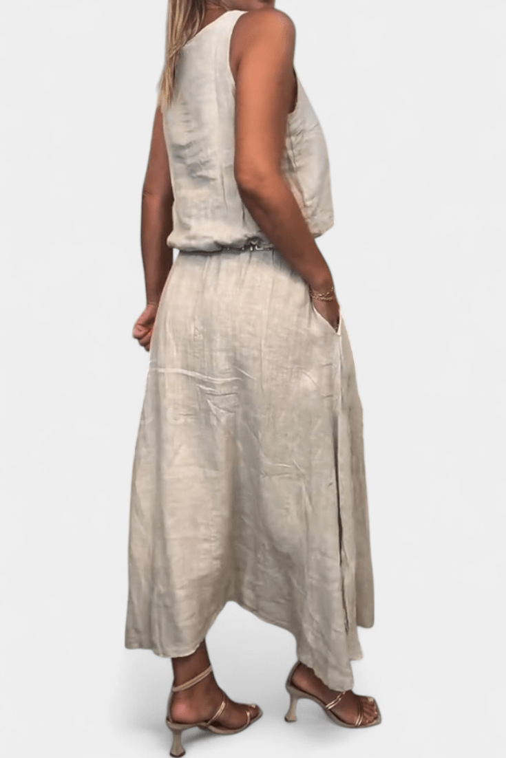 • Silhuet og detaljer: En løs vest uden ærmer og en lang, draperet nederdel med sidelommer til diskret funktion.