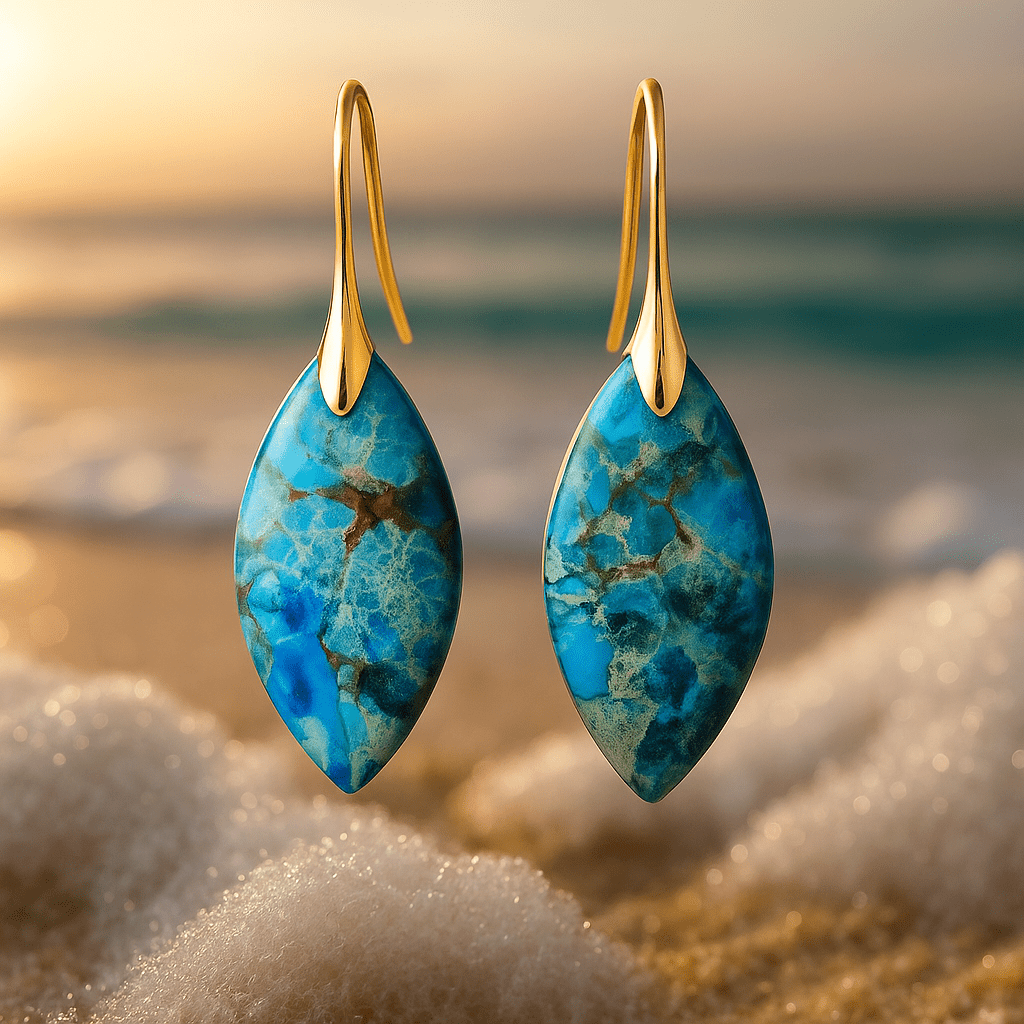 Silje | Havblå øreringe forener håndværkets finesse med kystens lysende skønhed. Inspireret af Elafonissis blå magi fanger de turkise nuancer vandets klarhed og en rosafarvet strand, mens gyldne og sandfarvede strøg gennem stenen giver glans, dybde og et let spil af farver. Hvert par er håndlavet af nøje udvalgte sten og en unik mønsterstruktur, så ingen sæt er ens. Som del af Avelina-kollektionen udgives dette sæt i begrænsede partier og inviterer til ejerskab af noget særligt og tidløst, med provenance og varig værdi.
